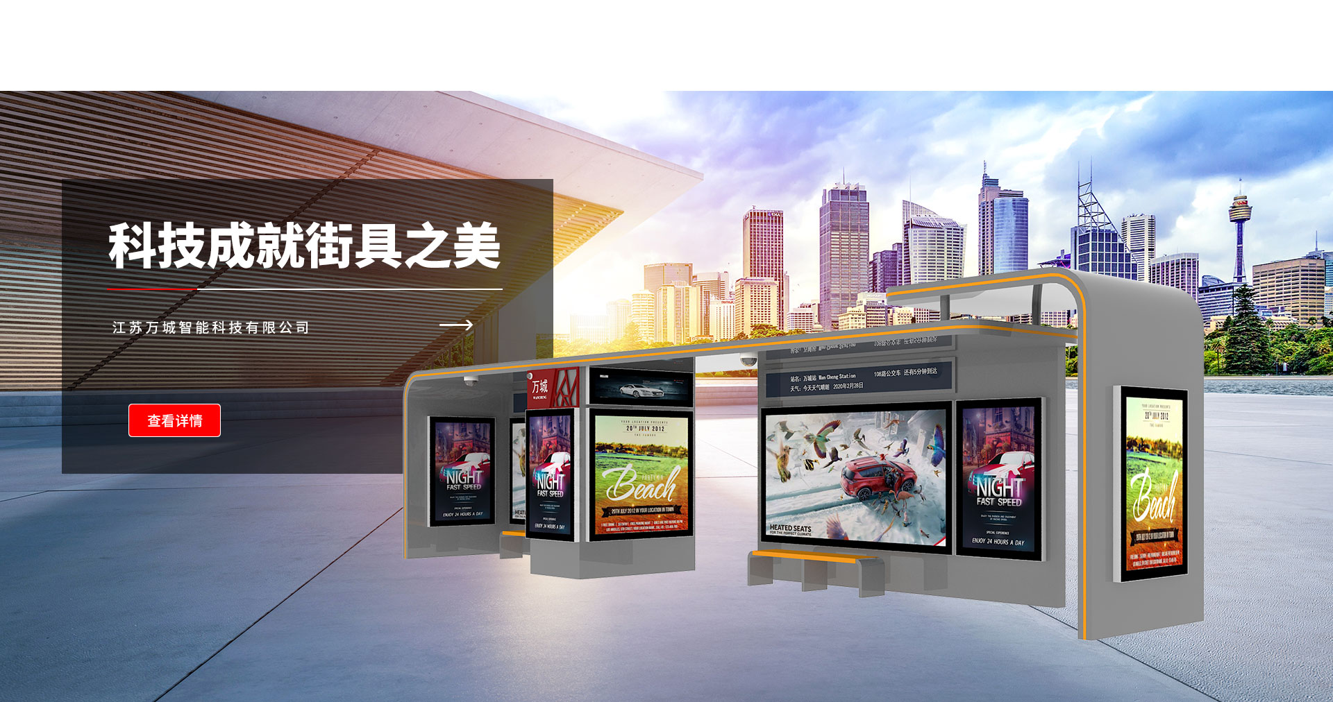 江蘇萬城智能科技有限公司是一家專業(yè)從事候車亭、公交站臺、公交候車亭生產制造廠家,提供項目設計、價格核算、生產安裝一站式服務。產品涵蓋城市、鄉(xiāng)鎮(zhèn)、仿古、中式、不銹鋼、現代、智能等多種候車亭類型。同時根據客戶的需求加工定制各種型號、規(guī)格的公交站牌、指路牌、站臺護欄、候車亭座椅等配套設施。萬城智能坐落于風景秀麗的西楚霸王項羽故鄉(xiāng),在江蘇省宿遷經濟開發(fā)區(qū)振興大道東側,蘇州路南側(原三鼎織造院內13-14號廠房)。
